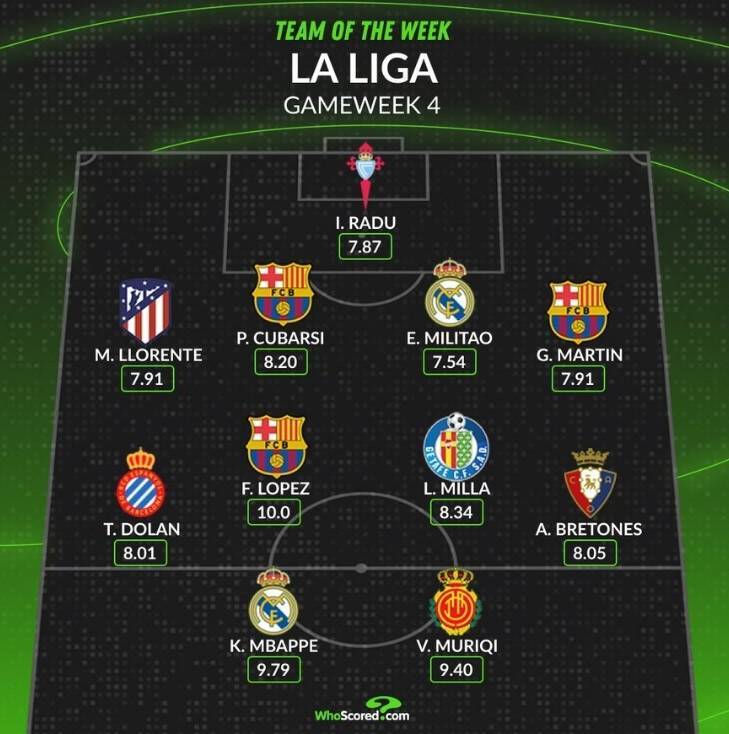 Whoscored评本轮西甲最佳阵:姆巴佩领衔,费尔明,米利唐在列
